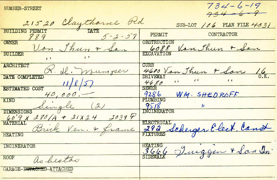 21520 Claythorne Road Shaker Heights, OH 44122 PARCEL ID: 734-06-019 Building Permit Date: 05-02-1957 Plan File Number: 4031 Microfilm Roll: Roll#59 Neighborhood: Mercer Owner: Von Thun and Son Builder: Von Thun and Son Architect: Mumper, R. D. Estimated Cost: 40000 Date Completed: 11-08-1957 Kind: Single, Single Residence or Dwelling (2) Material: Brick Veneer and Frame Roof: Asbestos Garage: attached |