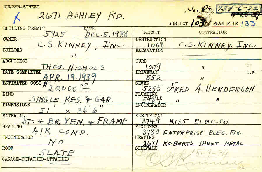 2671 Ashley Road Shaker Heights, OH 44122 PARCEL ID: 734-06-022 Building Permit Date: 12-05-1938 Plan File Number: 133 Neighborhood: Mercer Owner: C. S. Kinney, Inc. Builder: C. S. Kinney, Inc. Architect: Nichols, Theodore Estimated Cost: 20000 Date Completed: 04-19-1939 Kind: Single Dwelling and Garage Material: Stone and Brick Veneer and Frame Heating: Air Conditioned Roof: Slate Garage: attached |