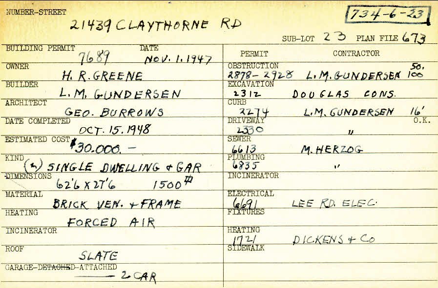 21439 Claythorne Road Shaker Heights, OH 44122 PARCEL ID: 734-06-023 Building Permit Date: 11-01-1947 Plan File Number: 673 scanned, 10382, 12703 Microfilm Roll: Roll008, NewRoll#3, NewRoll#14 Neighborhood: Mercer Owner: Greene, H. R. Builder: Gundersen, L. M. Architect: Burrows, George Estimated Cost: 30000 Date Completed: 10-15-1948 Kind: Single Dwelling and Garage (2) Material: Brick Veneer and Frame Heating: Forced Air Roof: Slate Garage: attached 2 car |