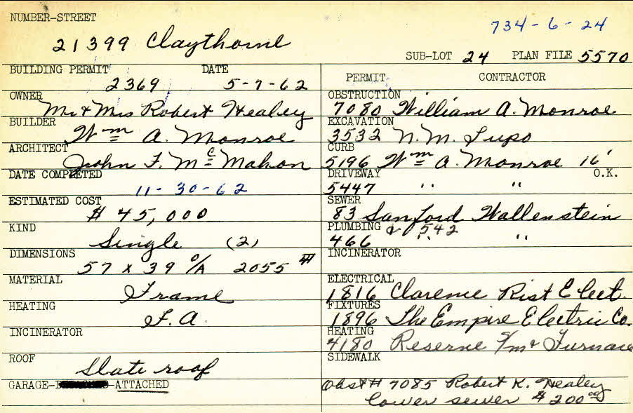21399 Claythorne Road Shaker Heights, OH 44122 PARCEL ID: 734-06-024 Building Permit Date: 05-07-1962 Plan File Number: 5570 Microfilm Roll: Roll#75 Neighborhood: Mercer Owner: Healey, Mr. and Mrs. Robert Builder: Monroe, William A. Architect: McMahon, John F. Estimated Cost: 45000 Date Completed: 11-30-1962 Kind: Single, Single Residence or Dwelling (2) Material: Frame Heating: Forced Air Roof: Slate Garage: attached |