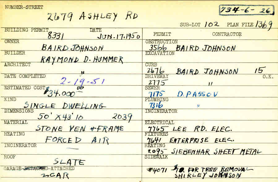 2679 Ashley Road Shaker Heights, OH 44122 PARCEL ID: 734-06-026 Building Permit Date: 06-17-1950 Plan File Number: 1369 scanned, 10561 Microfilm Roll: Roll016, NewRoll#4 Neighborhood: Mercer Owner: Johnson, Baird Builder: Hummer, Raymond D. Architect: Hummer, Raymond D. Estimated Cost: 34000 Date Completed: 02-19-1951 Kind: Single, Single Residence or Dwelling Material: Stone Veneer and Frame Heating: Forced Air Roof: Slate Garage: attached 2 car |