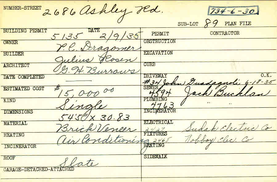 2686 Ashley Road Shaker Heights, OH 44122 PARCEL ID: 734-06-030 Building Permit Date: 02-09-1935 Plan File Number: 0 Neighborhood: Mercer Owner: Dragomer, P. C. Builder: Rosen, Julius Architect: Burrows, George H. Estimated Cost: 15000 Kind: Single, Single Residence or Dwelling Material: Brick Veneer Heating: Air Conditioned Roof: Slate |