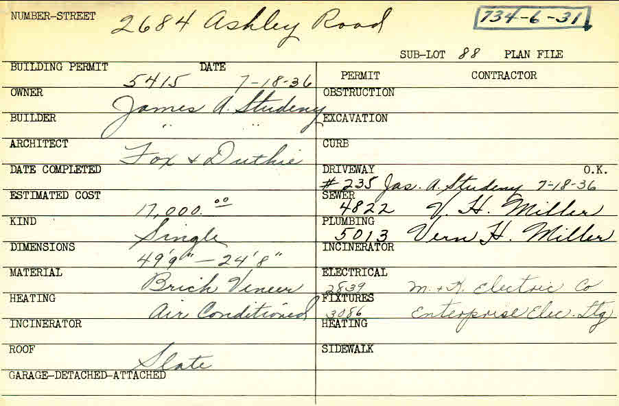 2684 Ashley Road Shaker Heights, OH 44122 PARCEL ID: 734-06-031 Building Permit Date: 07-18-1936 Plan File Number: 12206 Microfilm Roll: NewRoll#11 Neighborhood: Mercer Owner: Studeny, James A. Builder: Studeny, James A. Architect: Fox and Duthie Estimated Cost: 17000 Kind: Single, Single Residence or Dwelling Material: Brick Veneer Heating: Air Conditioned Roof: Slate |