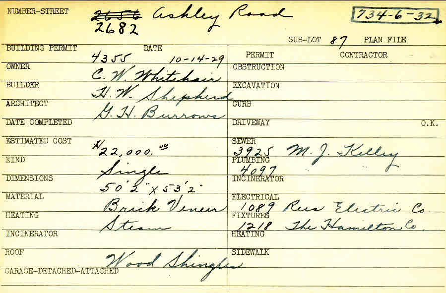 2682 Ashley Road Shaker Heights, OH 44122 PARCEL ID: 734-06-032 Building Permit Date: 10-14-1929 Plan File Number: 0 Neighborhood: Mercer Owner: Whitehair, C. W. Builder: Shepherd, H. W. Architect: Burrows, George H. Estimated Cost: 22000 Kind: Single, Single Residence or Dwelling Material: Brick Veneer Heating: Steam Roof: Wood Shingle |