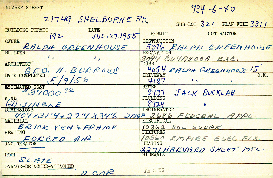 21749 Shelburne Road Shaker Heights, OH 44122 PARCEL ID: 734-06-040 Building Permit Date: 07-27-1955 Plan File Number: 3311 Microfilm Roll: Roll#48 Neighborhood: Mercer Owner: Greenhouse, Ralph Builder: Greenhouse, Ralph Architect: Burrows, George H. Estimated Cost: 37000 Date Completed: 05-09-1956 Kind: Single, Single Residence or Dwelling (2) Material: Brick Veneer and Frame Heating: Forced Air Roof: Slate Garage: attached 2 car |
