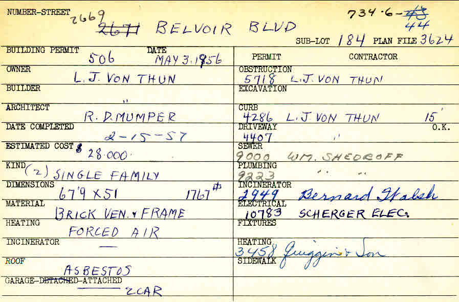 2669 Belvoir Boulevard Shaker Heights, OH 44122 PARCEL ID: 734-06-044 Building Permit Date: 05-03-1956 Plan File Number: 3624 Microfilm Roll: Roll#54 Neighborhood: Mercer Owner: Von Thun, L. J. Builder: Von Thun, L. J. Architect: Mumper, R. D. Estimated Cost: 28000 Date Completed: 02-15-1957 Kind: Single, Single Residence or Dwelling (2) Material: Brick Veneer and Frame Heating: Forced Air Roof: Asbestos Garage: attached 2 car |