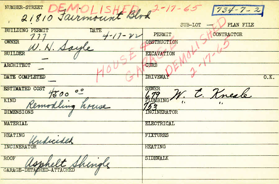 21810 Fairmount Boulevard Shaker Heights, OH 44122 PARCEL ID: 734-07-002 Building Permit Date: 04-17-1922 Plan File Number: 6614, 6810 Microfilm Roll: Roll#87, Roll#88 Neighborhood: Mercer Owner: Soyle, W. H. Estimated Cost: 4500 Roof: Asphalt Shingles |