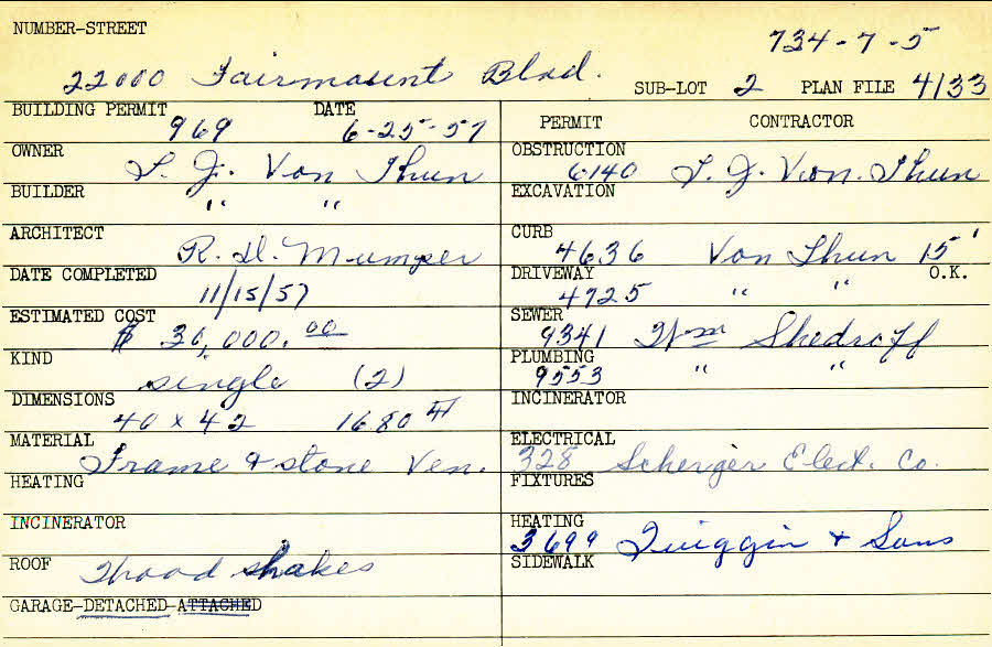 22000 Fairmount Boulevard Shaker Heights, OH 44122 PARCEL ID: 734-07-005 Building Permit Date: 06-25-1957 Plan File Number: 4133, 13061 scanned Microfilm Roll: Roll#61, NewRoll19 Neighborhood: Mercer Owner: Von Thun, L. J. Builder: Von Thun, L. J. Architect: Mumper, R. D. Estimated Cost: 30000 Date Completed: 11-15-1957 Kind: Single, Single Residence or Dwelling (2) Material: Frame and Stone Veneer Roof: Wood Shakes Garage: detached |