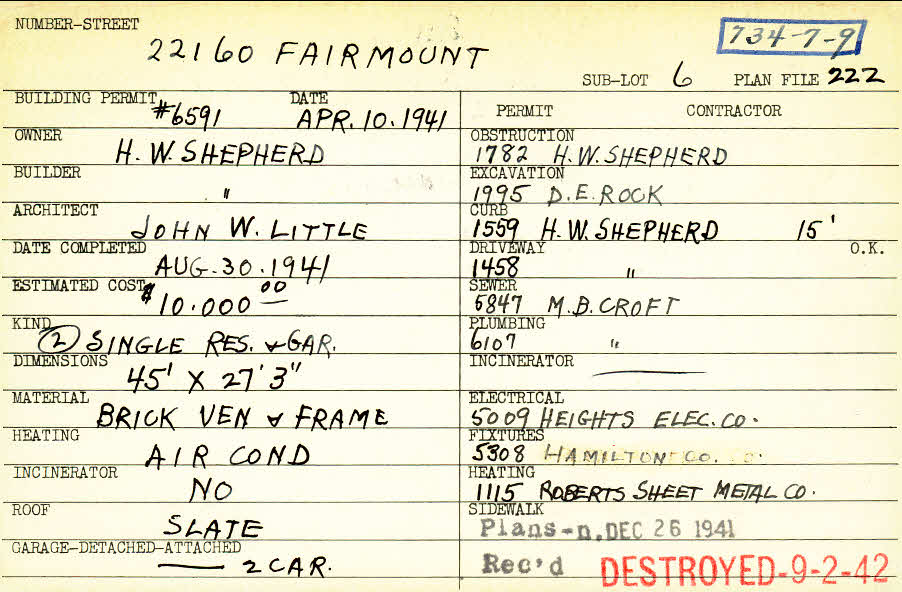 22160 Fairmount Boulevard Shaker Heights, OH 44122 PARCEL ID: 734-07-009 Building Permit Date: 04-10-1941 Plan File Number: 222, 6008 Microfilm Roll: Roll#80 Neighborhood: Mercer Owner: Shepherd, H. W. Builder: Shepherd, H. W. Architect: Little, John W. Estimated Cost: 10000 Date Completed: 08-30-1941 Kind: Single Dwelling and Garage (2) Material: Brick Veneer and Frame Heating: Air Conditioned Roof: Slate Garage: attached 2 car |