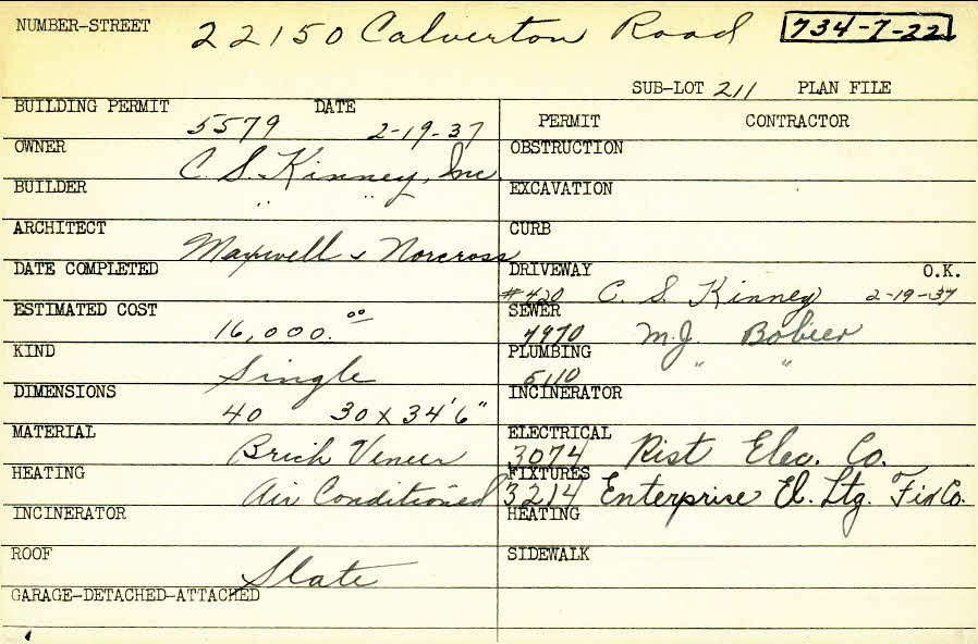 22150 Calverton Road Shaker Heights, OH 44122 PARCEL ID: 734-07-022 Building Permit Date: 02-19-1937 Plan File Number: 4447 Microfilm Roll: Roll#63 Neighborhood: Mercer Owner: C.S. Kinney, Inc. Builder: C.S. Kinney, Inc. Architect: Maxwell and Norcross Estimated Cost: 16000 Kind: Single, Single Residence or Dwelling Material: Brick Veneer Heating: Air Conditioned Roof: Slate |
