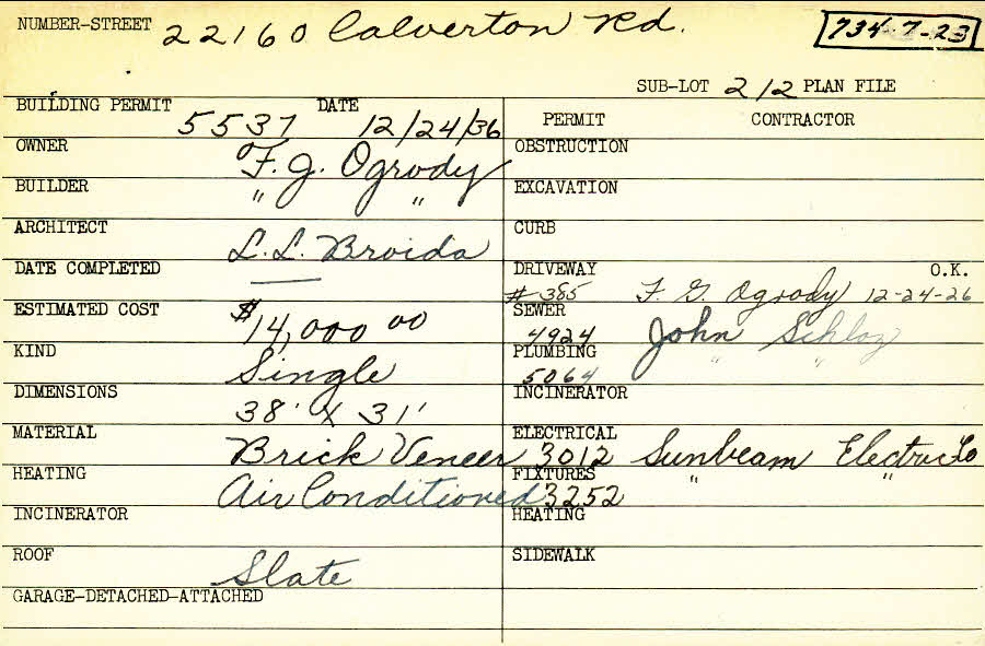 22160 Calverton Road Shaker Heights, OH 44122 PARCEL ID: 734-07-023 Building Permit Date: 12-24-1956 Plan File Number: 9854 Microfilm Roll: Roll#105 Neighborhood: Mercer Owner: Ogrody, F.J. Builder: Ogrody, F.J. Architect: Broida, L.L. Estimated Cost: 14000 Kind: Single, Single Residence or Dwelling Material: Brick Veneer Heating: Air Conditioned Roof: Slate |