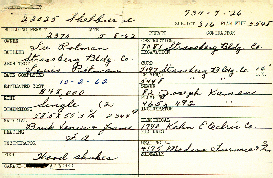 22025 Shelburne Road Shaker Heights, OH 44122 PARCEL ID: 734-07-026 Building Permit Date: 05-08-1962 Plan File Number: 5548 Microfilm Roll: Roll#75 Neighborhood: Mercer Owner: Rotman, Lee Builder: Strassberg Building Company Architect: Rotman, Louis Estimated Cost: 48000 Date Completed: 10-02-1962 Kind: Single, Single Residence or Dwelling (2) Material: Brick Veneer and Frame Heating: Forced Air Roof: Wood Shakes Garage: attached |