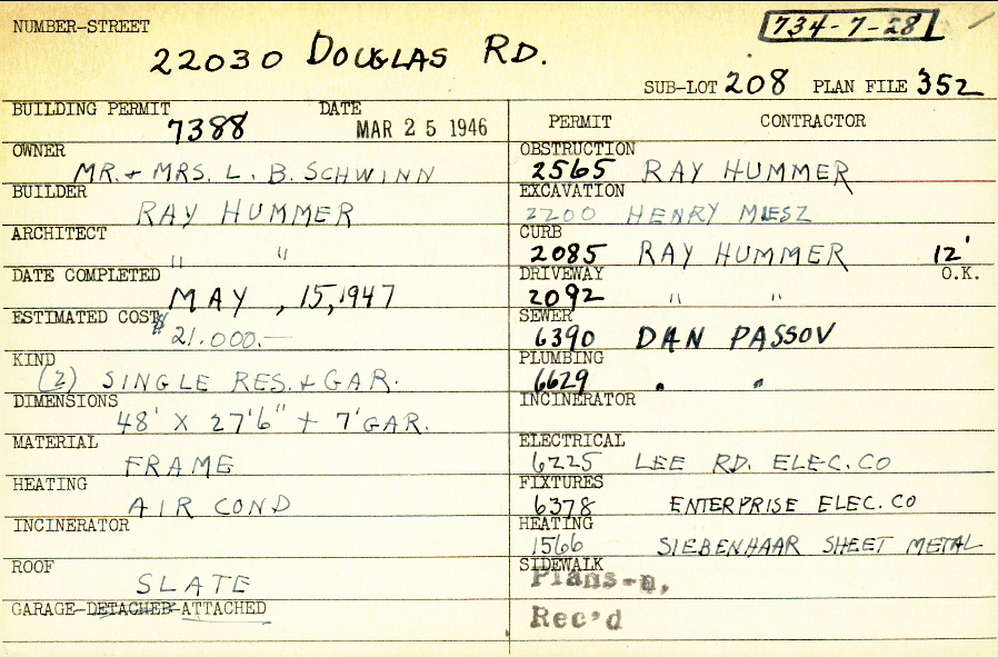 22030 Douglas Road Shaker Heights, OH 44122 PARCEL ID: 734-07-028 Building Permit Date: 03-25-1946 Plan File Number: 352, 4333 all scanned Microfilm Roll: Roll004, Roll062 Neighborhood: Mercer Owner: Schwinn, Mr. and Mrs. L. B. Builder: Hummer, Ray Architect: Hummer, Ray Estimated Cost: 21000 Date Completed: 05-15-1947 Kind: Single Dwelling and Garage (2) Material: Frame Heating: Air Conditioned Roof: Slate Garage: attached |