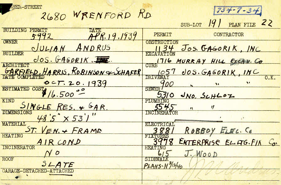 2680 Wrenford Road Shaker Heights, OH 44120 PARCEL ID: 734-07-034 Building Permit Date: 04-19-1939 Plan File Number: 22, 3481 Microfilm Roll: Roll#51 Neighborhood: Mercer Owner: Andrus, Julian Builder: Gagorik, Joseph Architect: Garfield, Harris, Robinson and Schafer Estimated Cost: 16500 Date Completed: 10-20-1939 Kind: Single Dwelling and Garage Material: Stone Veneer and Frame Heating: Air Conditioned Roof: Slate Garage: attached |  |