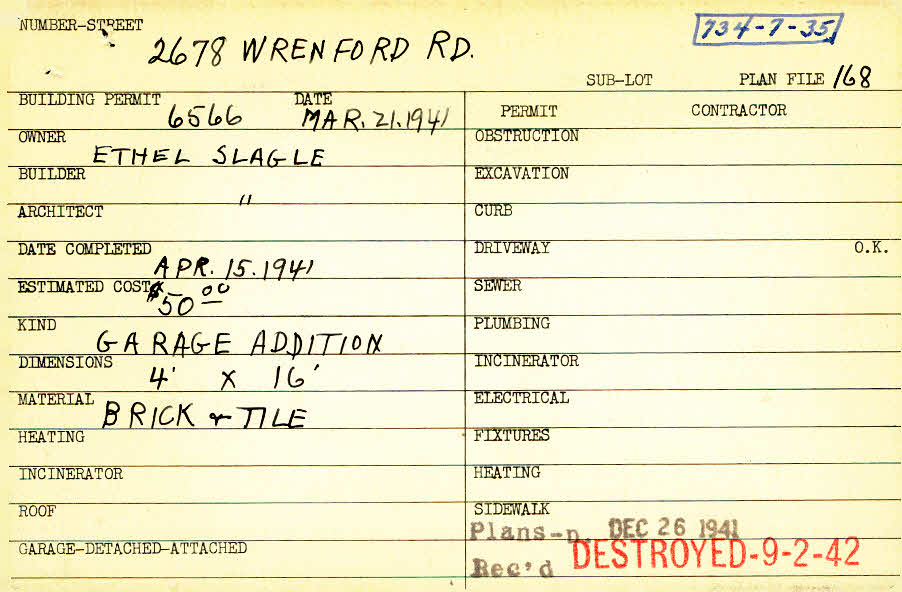 2678 Wrenford Road Shaker Heights, OH 44120 PARCEL ID: 734-07-035 Building Permit Date: 03-21-1941 Plan File Number: 168, 7871, 7895 Microfilm Roll: Roll#95 Neighborhood: Mercer Owner: Slagle, Ethel Builder: Slagle, Ethel Estimated Cost: 50 Date Completed: 04-15-1941 Material: Brick and Tile |  |
