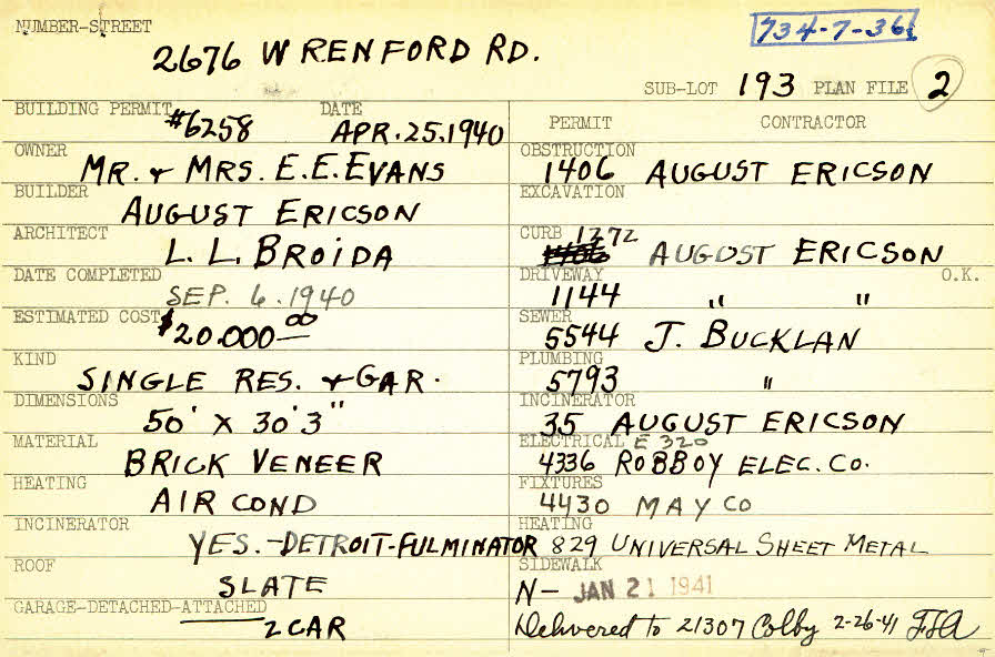 2676 Wrenford Road Shaker Heights, OH 44120 PARCEL ID: 734-07-036 Building Permit Date: 04-25-1940 Plan File Number: 2, 9796, 90-114* Microfilm Roll: Roll#104, NewRoll#16 Neighborhood: Mercer Owner: Evans, Mr. and Mrs. E. E. Builder: Ericson, August Architect: Broida, L. L. Estimated Cost: 20000 Date Completed: 09-06-1940 Kind: Single Dwelling and Garage Material: Brick Veneer Heating: Air Conditioned Roof: Slate Garage: attached 2 car |  |