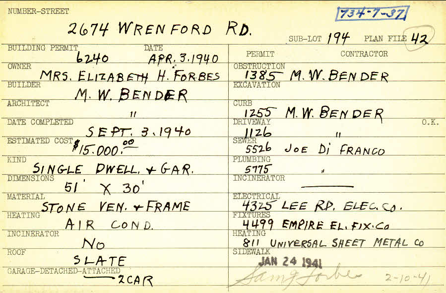 2674 Wrenford Road Shaker Heights, OH 44120 PARCEL ID: 734-07-037 Building Permit Date: 04-03-1940 Plan File Number: 42, 6962 Microfilm Roll: Roll#90 Neighborhood: Mercer Owner: Forbes, Mrs. Elizabeth H. Builder: Bender, M. W. Architect: Bender, M. W. Estimated Cost: 15000 Date Completed: 09-03-1940 Kind: Single Dwelling and Garage Material: Stone Veneer and Frame Heating: Air Conditioned Roof: Slate Garage: attached 2 car |  |
