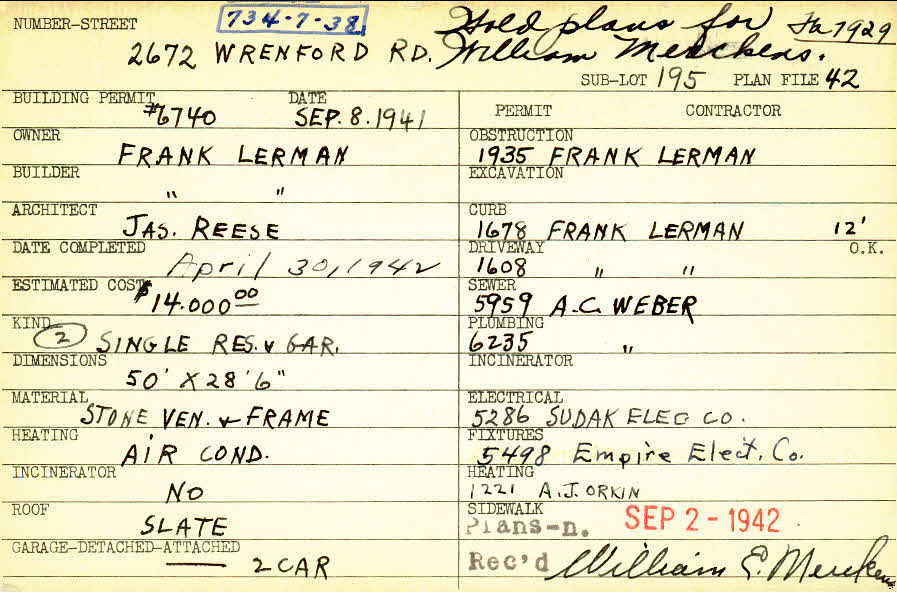 2672 Wrenford Road Shaker Heights, OH 44120 PARCEL ID: 734-07-038 Building Permit Date: 09-08-1941 Plan File Number: 42, 7994 Microfilm Roll: Roll#95 Neighborhood: Mercer Owner: Lerman, Frank Builder: Lerman, Frank Architect: Reese, James A. Estimated Cost: 14000 Date Completed: 04-30-1942 Kind: Single Dwelling and Garage (2) Material: Stone Veneer and Frame Heating: Air Conditioned Roof: Slate Garage: attached 2 car |  |