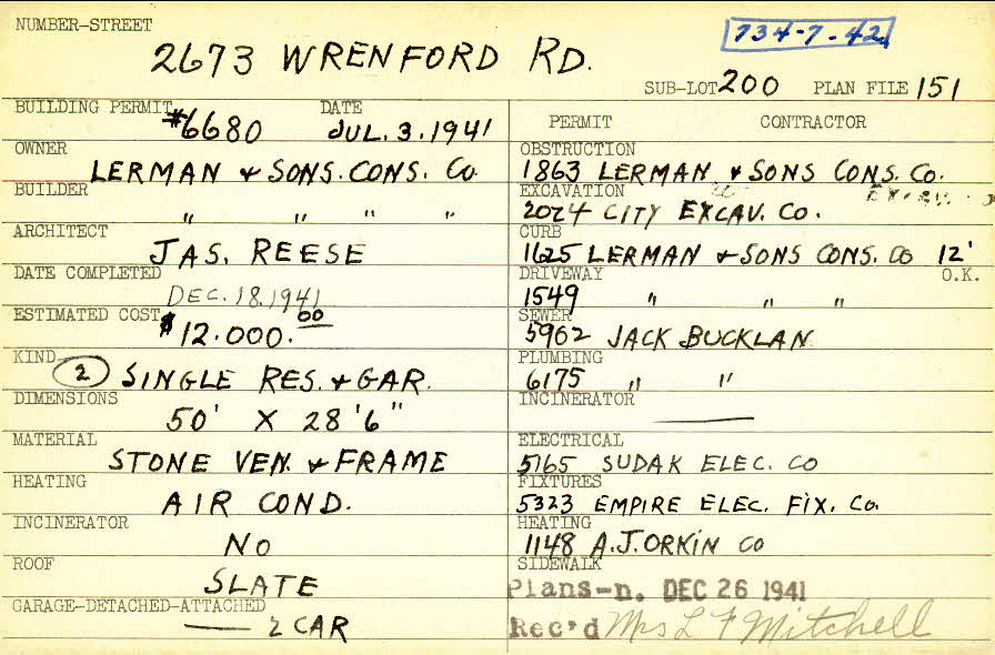 2673 Wrenford Road Shaker Heights, OH 44120 PARCEL ID: 734-07-042 Building Permit Date: 07-03-1941 Plan File Number: 151 Neighborhood: Mercer Owner: Lerman and Sons Construction Company Builder: Lerman and Sons Construction Company Architect: Reese, James A. Estimated Cost: 12000 Date Completed: 12-18-1941 Kind: Single Dwelling and Garage (2) Material: Stone Veneer and Frame Heating: Air Conditioned Roof: Slate Garage: attached 2 car |  |