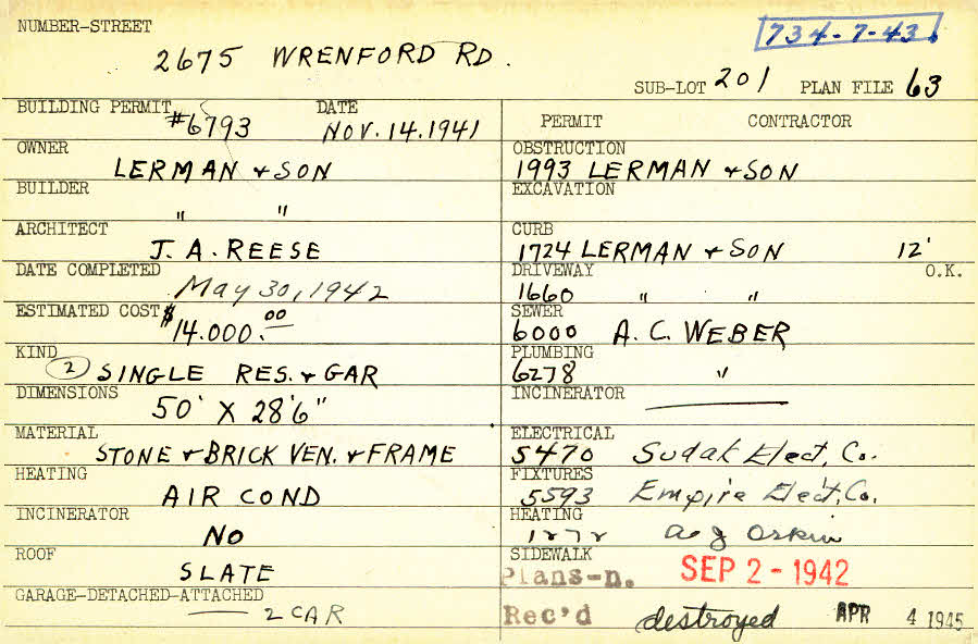 2675 Wrenford Road Shaker Heights, OH 44120 PARCEL ID: 734-07-043 Building Permit Date: 11-14-1941 Plan File Number: 63, 5876 Microfilm Roll: Roll#79 Neighborhood: Mercer Owner: Lerman and Son Builder: Lerman and Son Architect: Reese, James A. Estimated Cost: 14000 Date Completed: 05-30-1942 Kind: Single Dwelling and Garage (2) Material: Stone and Brick Veneer and Frame Heating: Air Conditioned Roof: Slate Garage: attached 2 car |  |