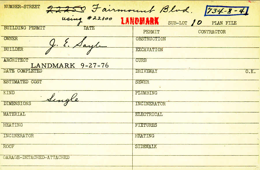 22300 Fairmount Boulevard Shaker Heights, OH 44122 PARCEL ID: 734-08-004 Plan File Number: 687 scanned, 2874 scanned, 6538, 7112 Microfilm Roll: Roll008, Roll041, Roll#86, Roll#91 Neighborhood: Mercer Owner: Sayle, J. E. Kind: Single, Single Residence or Dwelling |