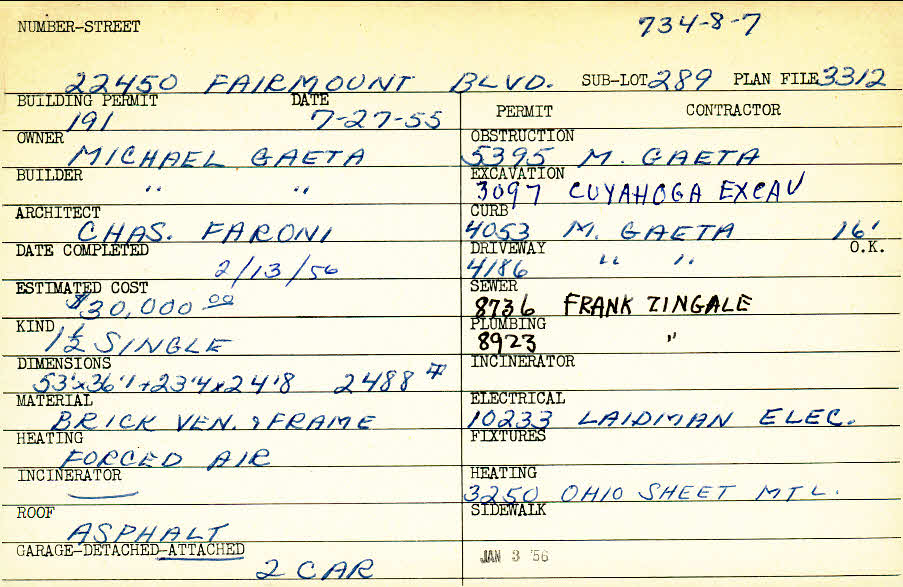 22450 Fairmount Boulevard Shaker Heights, OH 44122 PARCEL ID: 734-08-007 Building Permit Date: 07-27-1955 Plan File Number: 3312 Neighborhood: Mercer Owner: Gaeta, Michael Builder: Gaeta, Michael Architect: Faroni, Charles Estimated Cost: 30000 Date Completed: 02-13-1956 Kind: Single, Single Residence or Dwelling Material: Brick Veneer and Frame Heating: Forced Air Roof: Asphalt Garage: attached 2 car |