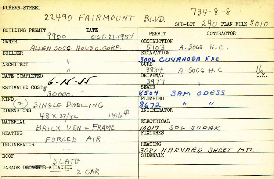 22490 Fairmount Boulevard Shaker Heights, OH 44122 PARCEL ID: 734-08-008 Building Permit Date: 10-27-1954 Plan File Number: 3010, 10612 Microfilm Roll: Roll#42, NewRoll#5 Neighborhood: Mercer Owner: Allen Sogg Housing Corporation Builder: Allen Sogg Housing Corporation Architect: Allen Sogg Housing Corporation Estimated Cost: 30000 Date Completed: 06-15-1955 Kind: Single, Single Residence or Dwelling (2) Material: Brick Veneer and Frame Heating: Forced Air Roof: Slate Garage: attached 2 car |
