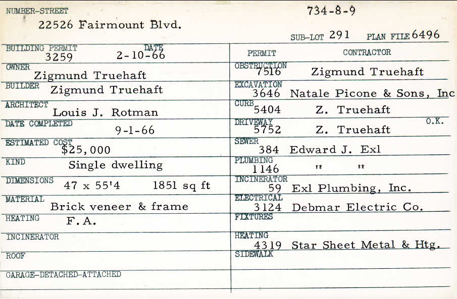 22526 Fairmount Boulevard Shaker Heights, OH 44122 PARCEL ID: 734-08-009 Building Permit Date: 02-10-1966 Plan File Number: 6496 Microfilm Roll: Roll#86 Neighborhood: Mercer Owner: Truehaft, Zigmund Builder: Truehaft, Zigmund Architect: Rotman, Louis J. Estimated Cost: 25000 Date Completed: 09-01-1966 Kind: Single, Single Residence or Dwelling Material: Brick Veneer and Frame Heating: Forced Air |
