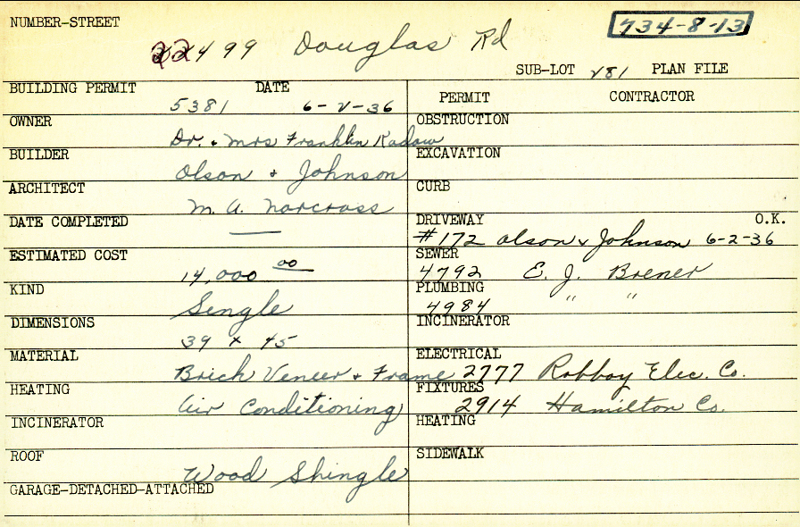 22499 Douglas Road Shaker Heights, OH 44122 PARCEL ID: 734-08-013 Building Permit Date: 06-02-1936 Plan File Number: 0 Neighborhood: Mercer Owner: Kadow, Dr. and Mrs. Franklin Builder: Olson and Johnson Architect: Norcross, M. A. Estimated Cost: 14000 Kind: Single, Single Residence or Dwelling Material: Brick Veneer and Frame Heating: Air Conditioned Roof: Wood Shingle Card Available: yes |