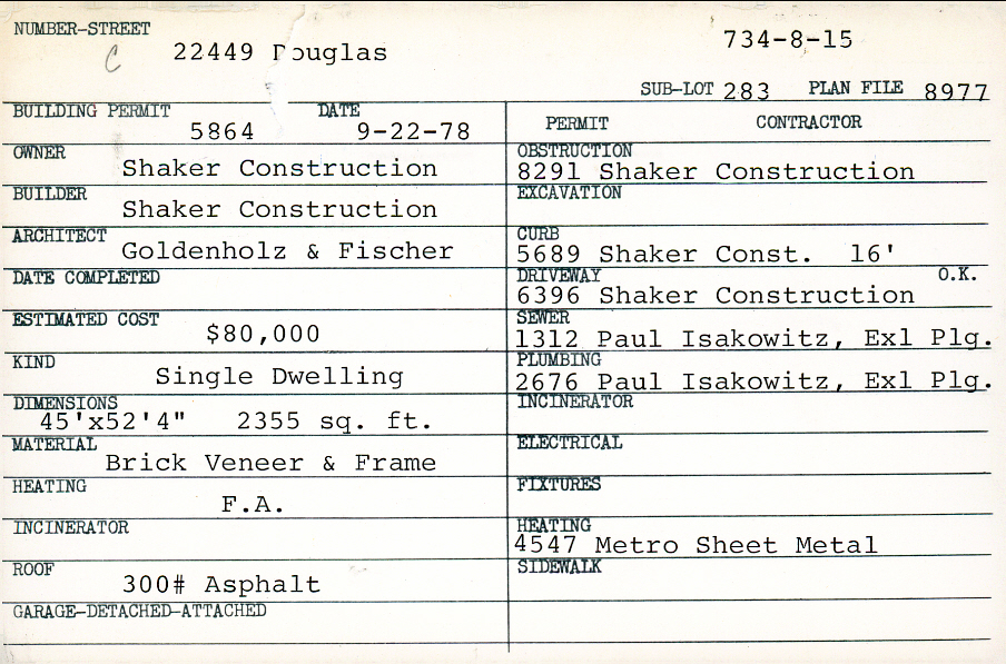 22449 Douglas Road Shaker Heights, OH 44122 PARCEL ID: 734-08-015 Building Permit Date: 09-22-1978 Plan File Number: 8977, 10692 Microfilm Roll: NewRoll#5 Neighborhood: Mercer Owner: Shaker Construction Builder: Shaker Construction Architect: Goldenholz and Fischer Estimated Cost: 80000 Kind: Single, Single Residence or Dwelling Material: Brick Veneer and Frame Heating: Forced Air Roof: 300# Min Asphalt |