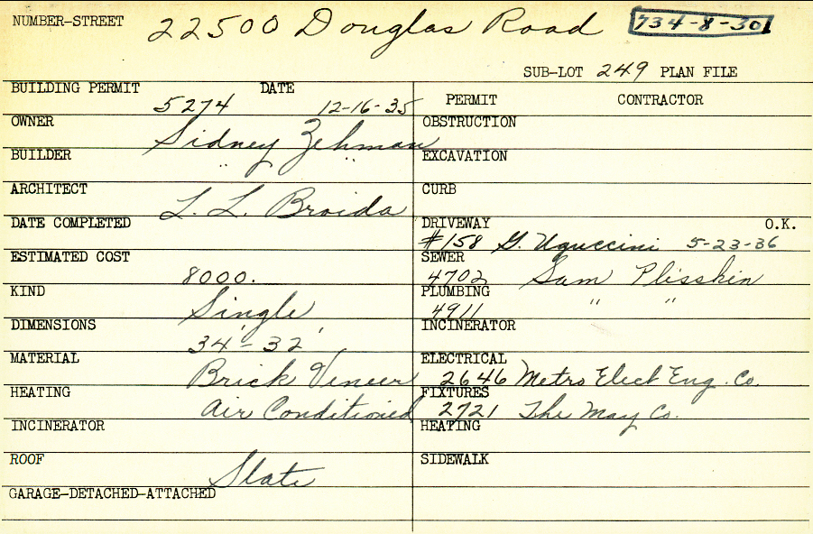 22500 Douglas Road Shaker Heights, OH 44122 PARCEL ID: 734-08-030 Building Permit Date: 12-16-1935 Plan File Number: 12918 all scanned Microfilm Roll: NewRoll19 Neighborhood: Mercer Owner: Zehman, Sidney Builder: Zehman, Sidney Architect: Broida, L. L. Estimated Cost: 8000 Kind: Single, Single Residence or Dwelling Material: Brick Veneer Heating: Air Conditioned Roof: Slate |