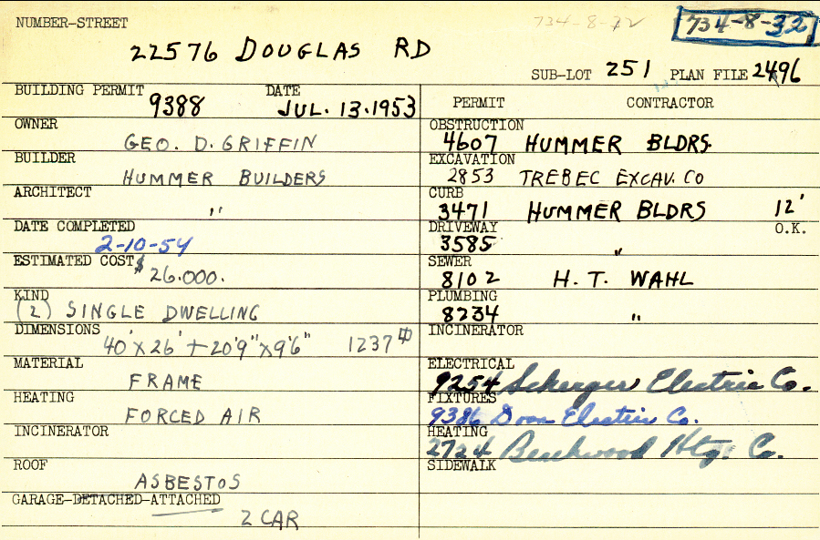 22576 Douglas Road Shaker Heights, OH 44122 PARCEL ID: 734-08-032 Building Permit Date: 07-13-1953 Plan File Number: 2496 scanned, 4538 Microfilm Roll: Roll035, Roll#63 Neighborhood: Mercer Owner: Griffin, George D. Builder: Hummer Builders Architect: Hummer Builders Estimated Cost: 26000 Date Completed: 02-10-1954 Kind: Single, Single Residence or Dwelling (2) Material: Frame Heating: Forced Air Roof: Asbestos Garage: attached 2 car |