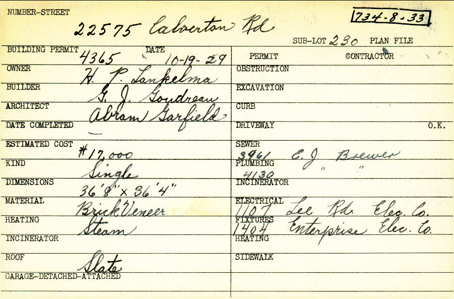 22575 Calverton Road Shaker Heights, OH 44122 PARCEL ID: 734-08-033 Building Permit Date: 10-19-1929 Neighborhood: Mercer Owner: Lankelma, H. P. Builder: Goudreau, G. J. Architect: Garfield, Abram Estimated Cost: 17000 Kind: Single, Single Residence or Dwelling Material: Brick Veneer Heating: Steam Roof: Slate Card Available: yes |