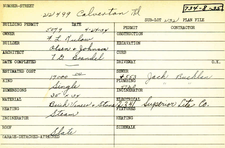 22499 Calverton Road Shaker Heights, OH 44122 PARCEL ID: 734-08-035 Building Permit Date: 04-24-1934 Plan File Number: 7915 Microfilm Roll: Roll#95 Neighborhood: Mercer Owner: Rulow, F. L. Builder: Olsen and Johnson Architect: Brandel, T. G. Estimated Cost: 17000 Kind: Single, Single Residence or Dwelling Material: Brick Veneer and Stone Heating: Steam Roof: Slate |