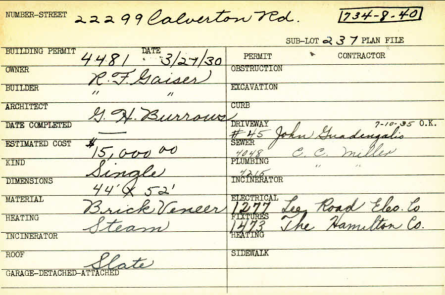 22299 Calverton Road Shaker Heights, OH 44122 PARCEL ID: 734-08-040 Building Permit Date: 03-27-1930 Plan File Number: 0 Neighborhood: Mercer Owner: Gaiser, R. F. Builder: Gaiser, R. F. Architect: Burrows, George H. Estimated Cost: 15000 Kind: Single, Single Residence or Dwelling Material: Brick Veneer Heating: Steam Roof: Slate Card Available: yes |
