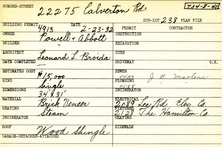 22275 Calverton Road Shaker Heights, OH 44122 PARCEL ID: 734-08-041 Building Permit Date: 02-23-1932 Plan File Number: 0 Neighborhood: Mercer Owner: Powell and Abbott Builder: Powell and Abbott Architect: Broida, Leonard L. Estimated Cost: 15000 Kind: Single, Single Residence or Dwelling Material: Brick Veneer Heating: Steam Roof: Wood Shingle Card Available: yes |