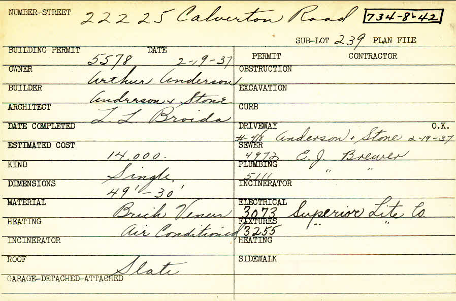 22225 Calverton Road Shaker Heights, OH 44122 PARCEL ID: 734-08-042 Building Permit Date: 02-19-1937 Plan File Number: 6042 Microfilm Roll: Roll#80 Neighborhood: Mercer Owner: Anderson, Arthur Builder: Anderson and Stone Architect: Broida, L. L. Estimated Cost: 14000 Kind: Single, Single Residence or Dwelling Material: Brick Veneer Heating: Air Conditioned Roof: Slate |
