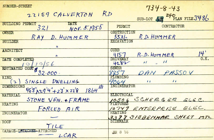 22159 Calverton Road Shaker Heights, OH 44122 PARCEL ID: 734-08-043 Building Permit Date: 11-05-1955 Plan File Number: 3486 Microfilm Roll: Roll#51 Neighborhood: Mercer Owner: Hummer, Ray D. Builder: Hummer, Ray D. Architect: Hummer, Ray D. Estimated Cost: 32000 Date Completed: 10-10-1956 Kind: Single, Single Residence or Dwelling (2) Material: Stone Veneer and Frame Heating: Forced Air Roof: Tile Garage: attached 2 car |