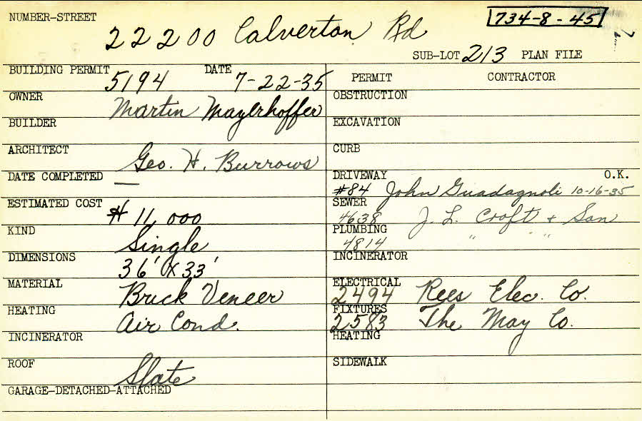 22200 Calverton Road Shaker Heights, OH 44122 PARCEL ID: 734-08-045 Building Permit Date: 07-22-1935 Plan File Number: 0 Neighborhood: Mercer Owner: Mayerhoffer, Martin Architect: Burrows, George H. Estimated Cost: 11000 Kind: Single, Single Residence or Dwelling Material: Brick Veneer Heating: Air Conditioned Roof: Slate Card Available: yes |