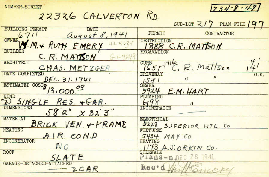 22326 Calverton Road Shaker Heights, OH 44122 PARCEL ID: 734-08-049 Building Permit Date: 08-08-1941 Plan File Number: 197 Neighborhood: Mercer Owner: Emery, W. M. and Ruth Builder: Mattson, C. R. Architect: Metzger, Charles A. Estimated Cost: 13000 Date Completed: 12-31-1941 Kind: Single Dwelling and Garage (2) Material: Brick Veneer and Frame Heating: Air Conditioned Roof: Slate Garage: attached 2 car |