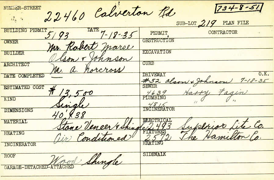 22460 Calverton Road Shaker Heights, OH 44122 PARCEL ID: 734-08-051 Building Permit Date: 07-18-1935 Plan File Number: 0 Neighborhood: Mercer Owner: Morse, Mr. Robert Builder: Olson and Johnson Architect: Norcross, M. A. Estimated Cost: 13500 Kind: Single, Single Residence or Dwelling Material: Stone Veneer and Shingle Heating: Air Conditioned Roof: Wood Shingle Card Available: yes |