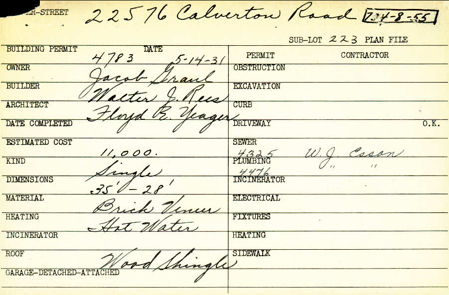 22576 Calverton Road Shaker Heights, OH 44122 PARCEL ID: 734-08-055 Building Permit Date: 05-14-1931 Plan File Number: 0 Neighborhood: Mercer Owner: Graul, Jacob Builder: Rees, Walter J. Architect: Yeager, Floyd E. Estimated Cost: 11000 Kind: Single, Single Residence or Dwelling Material: Brick Veneer Heating: Hot Water Roof: Wood Shingle Card Available: yes |
