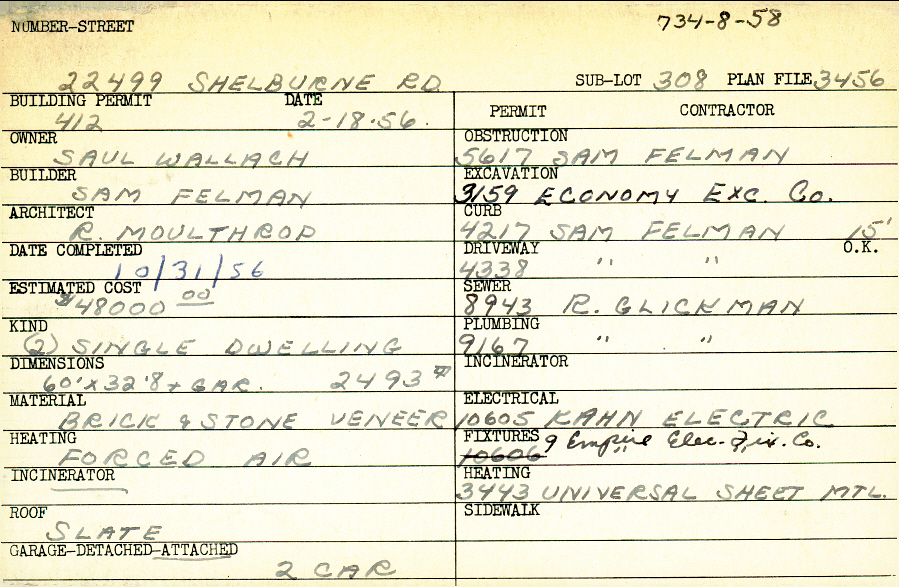 22499 Shelburne Road Shaker Heights, OH 44122 PARCEL ID: 734-08-058 Building Permit Date: 02-18-1956 Plan File Number: 3456 Microfilm Roll: Roll#51 Neighborhood: Mercer Owner: Wallach, Saul Builder: Felman, Sam Architect: Moulthrop, R. Estimated Cost: 48000 Date Completed: 10-31-1956 Kind: Single, Single Residence or Dwelling (2) Material: Brick and Stone Veneer Heating: Forced Air Roof: Slate Garage: attached 2 car |