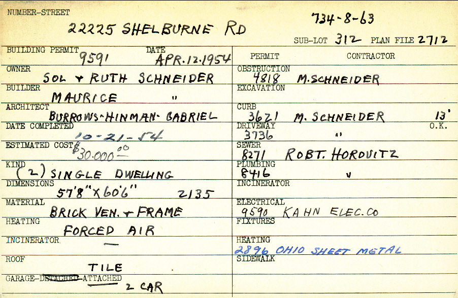 22225 Shelburne Road Shaker Heights, OH 44122 PARCEL ID: 734-08-063 Building Permit Date: 04-12-1954 Plan File Number: 2712 Microfilm Roll: Roll #37 Neighborhood: Mercer Owner: Schneider, Sol and Ruth Builder: Schneider, Maurice Architect: Burrows, Hinman, Gabriel Estimated Cost: 30000 Date Completed: 10-21-1954 Kind: Single, Single Residence or Dwelling (2) Material: Brick Veneer and Frame Heating: Forced Air Roof: Tile Garage: attached 2 car |