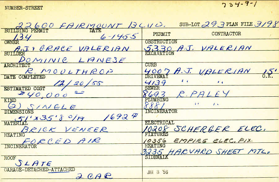 22600 Fairmount Boulevard Shaker Heights, OH 44122 PARCEL ID: 734-09-001 Building Permit Date: 06-14-1955 Plan File Number: 3198 Microfilm Roll: Roll#44 Neighborhood: Mercer Owner: Valerian, A. J. and Grace Builder: Lanese, Dominic Architect: Moulthrop, R. Estimated Cost: 40000 Date Completed: 12-20-1955 Kind: Single, Single Residence or Dwelling (2) Material: Brick Veneer Heating: Forced Air Roof: Slate Garage: attached 2 car |