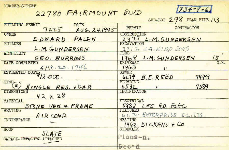 22780 Fairmount Boulevard Shaker Heights, OH 44122 PARCEL ID: 734-09-006 Building Permit Date: 08-24-1945 Plan File Number: 113, 1660 all scanned Microfilm Roll: Roll001, Roll025 Neighborhood: Mercer Owner: Palen, Edward Builder: Gundersen, L. M. Architect: Burrows, George Estimated Cost: 12000 Date Completed: 04-20-1946 Kind: Single Dwelling and Garage (2) Material: Stone Veneer and Frame Heating: Air Conditioned Roof: Slate Garage: attached |