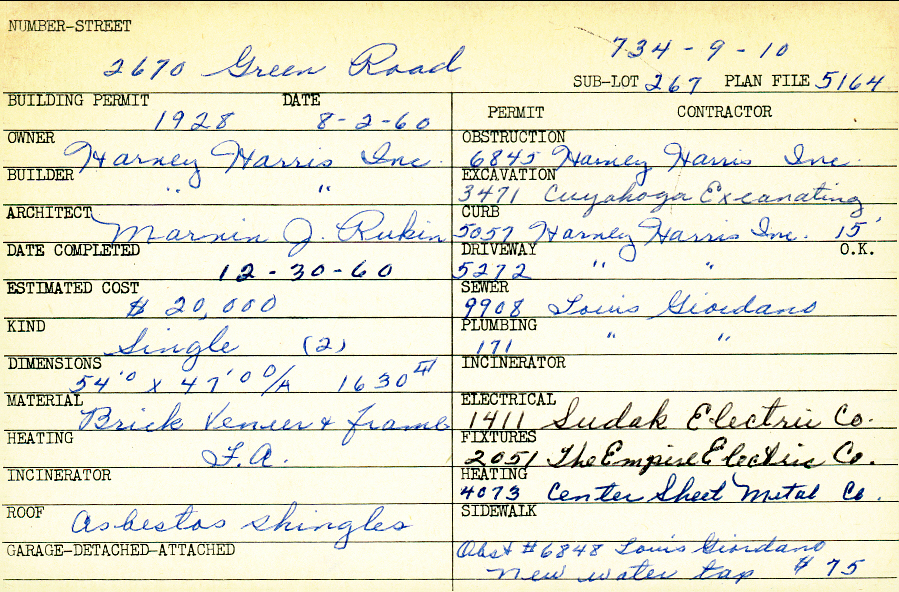 2670 Green Road Shaker Heights, OH 44122 PARCEL ID: 734-09-010 Building Permit Date: 08-02-1960 Plan File Number: 5164 Microfilm Roll: Roll#70 Neighborhood: Mercer Owner: Harvey Harris Inc. Builder: Harvey Harris Inc. Architect: Rukin, Marvin J. Estimated Cost: 20000 Date Completed: 12-30-1960 Kind: Single, Single Residence or Dwelling (2) Material: Brick Veneer and Frame Heating: Forced Air Roof: Asbestos Shingles |