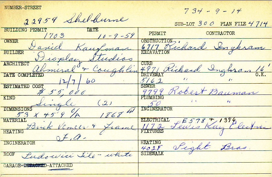 22959 Shelburne Road Shaker Heights, OH 44122 PARCEL ID: 734-09-014 Building Permit Date: 10-09-1959 Plan File Number: 4714 all scanned Microfilm Roll: Roll065 Neighborhood: Mercer Owner: Kaufman, David Builder: Display Studios Architect: Almiral and Coughlin Estimated Cost: 55000 Date Completed: 12-07-1960 Kind: Single, Single Residence or Dwelling (2) Material: Brick Veneer and Frame Heating: Forced Air Roof: Tile Garage: attached Blueprints: online, see link above |