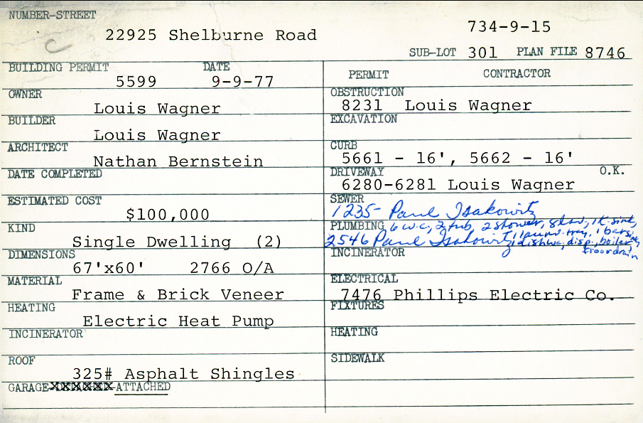 22925 Shelburne Road Shaker Heights, OH 44122 PARCEL ID: 734-09-015 Building Permit Date: 09-09-1977 Plan File Number: 8746 Microfilm Roll: Roll#98 Neighborhood: Mercer Owner: Wagner, Louis Builder: Wagner, Louis Architect: Bernstein, Nathan Estimated Cost: 100000 Kind: Single, Single Residence or Dwelling (2) Material: Frame and Brick Veneer Roof: 325# Asphalt Garage: attached |