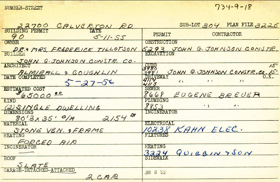 22700 Calverton Road Shaker Heights, OH 44122 PARCEL ID: 734-09-018 Building Permit Date: 05-11-1955 Plan File Number: 3225 Microfilm Roll: Roll#47 Neighborhood: Mercer Owner: Tillotson, Dr. and Mrs. Frederick Builder: John G. Johnson Construction Company Architect: Almirall and Coughlin Estimated Cost: 65000 Date Completed: 05-27-1956 Kind: Single, Single Residence or Dwelling (2) Material: Stone Veneer and Frame Heating: Forced Air Roof: Slate Garage: attached 2 car |